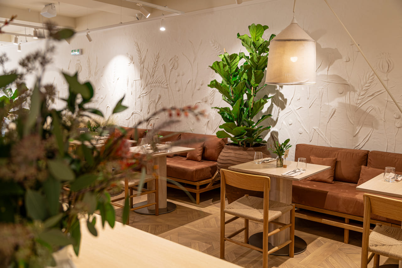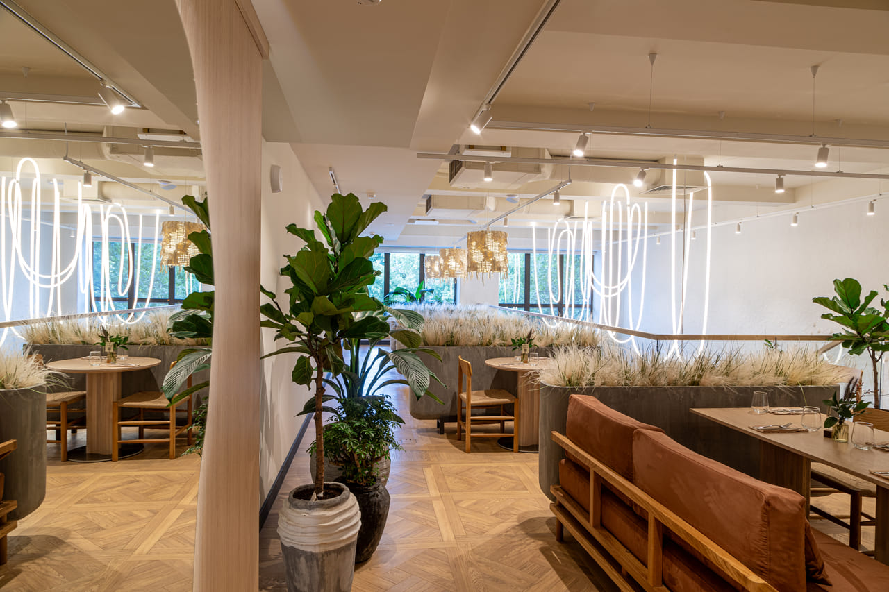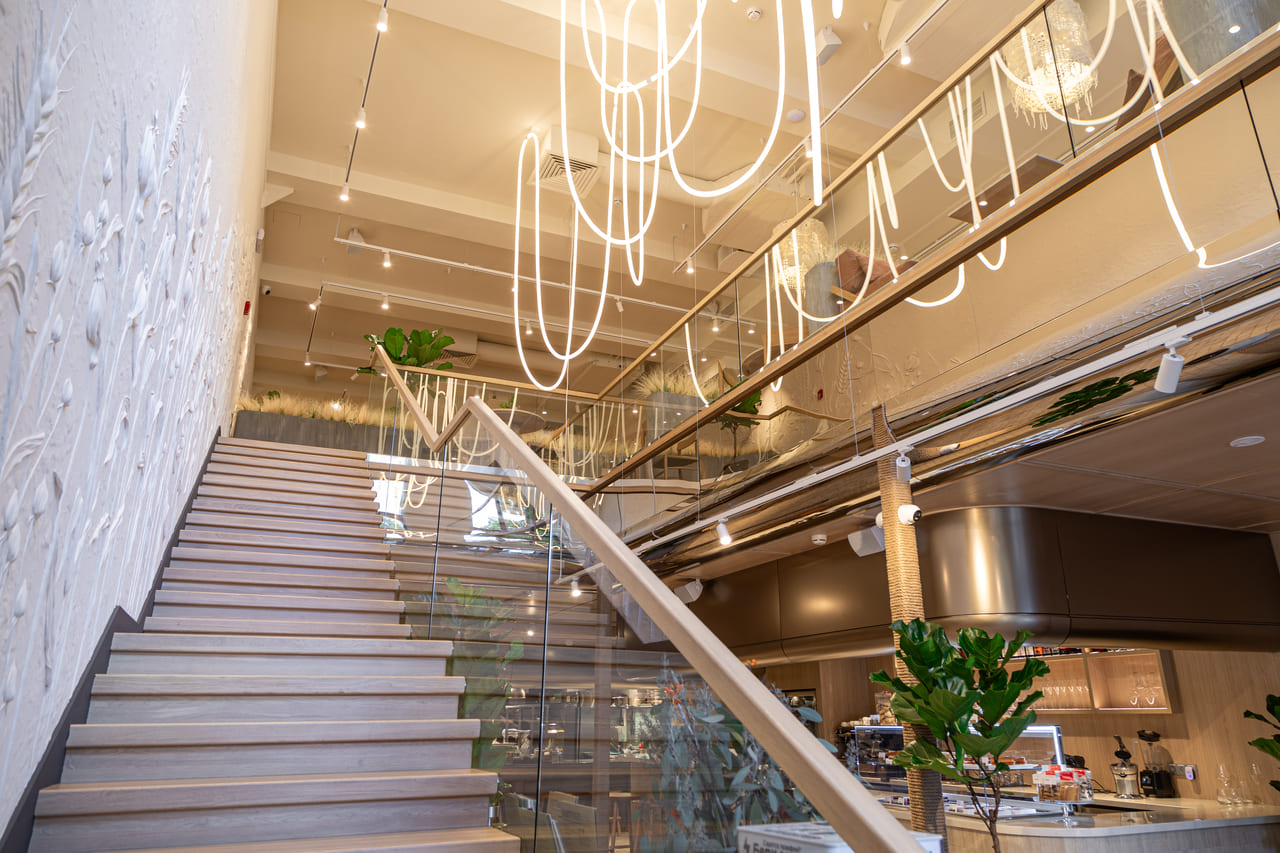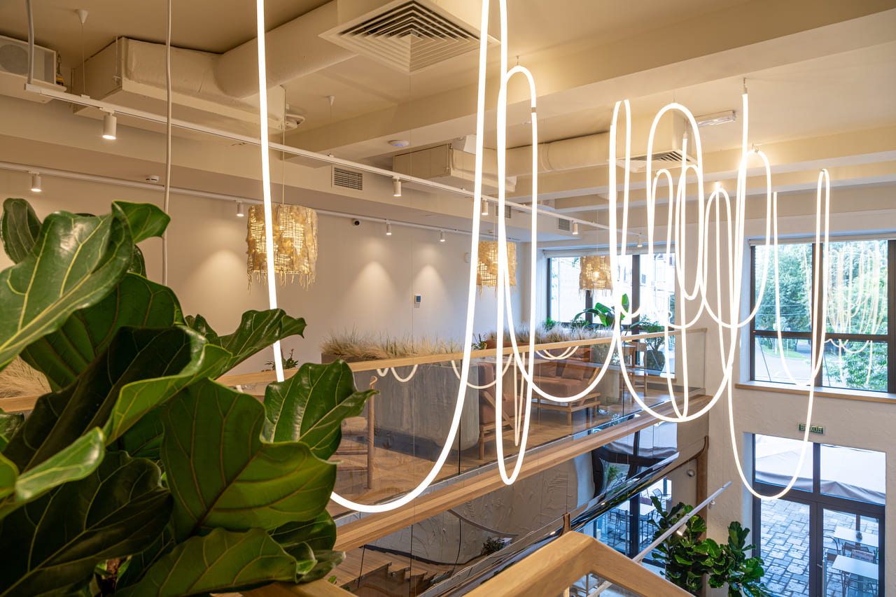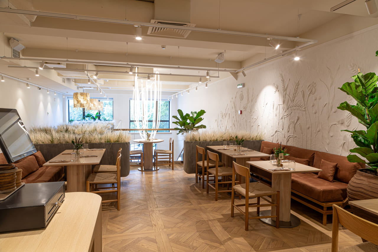 Теперь ресторан "М2 Органик Клуб" Соколе – просторный, светлый, с открытой кухней, большими окнами, зеленью и интересными световыми решениями.