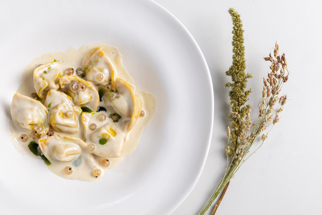 При заказе равиоли с папоротником и нежной рикоттой в соусе из кедрового ореха с белой смородиной и шпинатом — бокал игристого комплиментом!